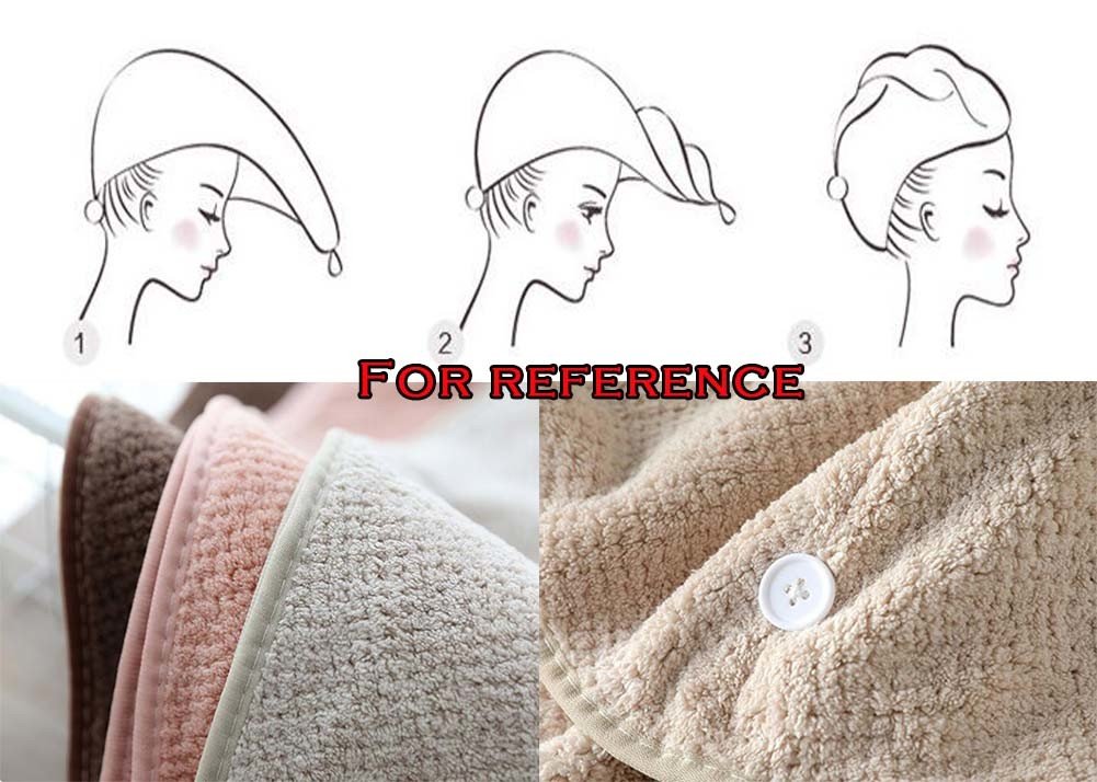 The hair towels are made of absorbent material woven.This hair drying towel is better than regular towel to dry you hair ; it's easy to use with the button design ; it's such convenient and lighweight. Extremely Soft; absorbent material to cut half of time to dry your hair; save your time and protect your hair from the blow drying damage. Suitable size for most head.