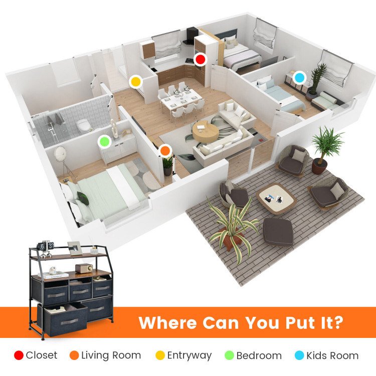 4.Industrial and Rustic Appearance: A good combination of black and brown colors enables this 5-drawer dresser to produce a retro feeling. What's more, the collision of metal and non-woven fabric imparts a sense of industrial style. Thus, this dresser storage unit is an ideal complement to any home style.